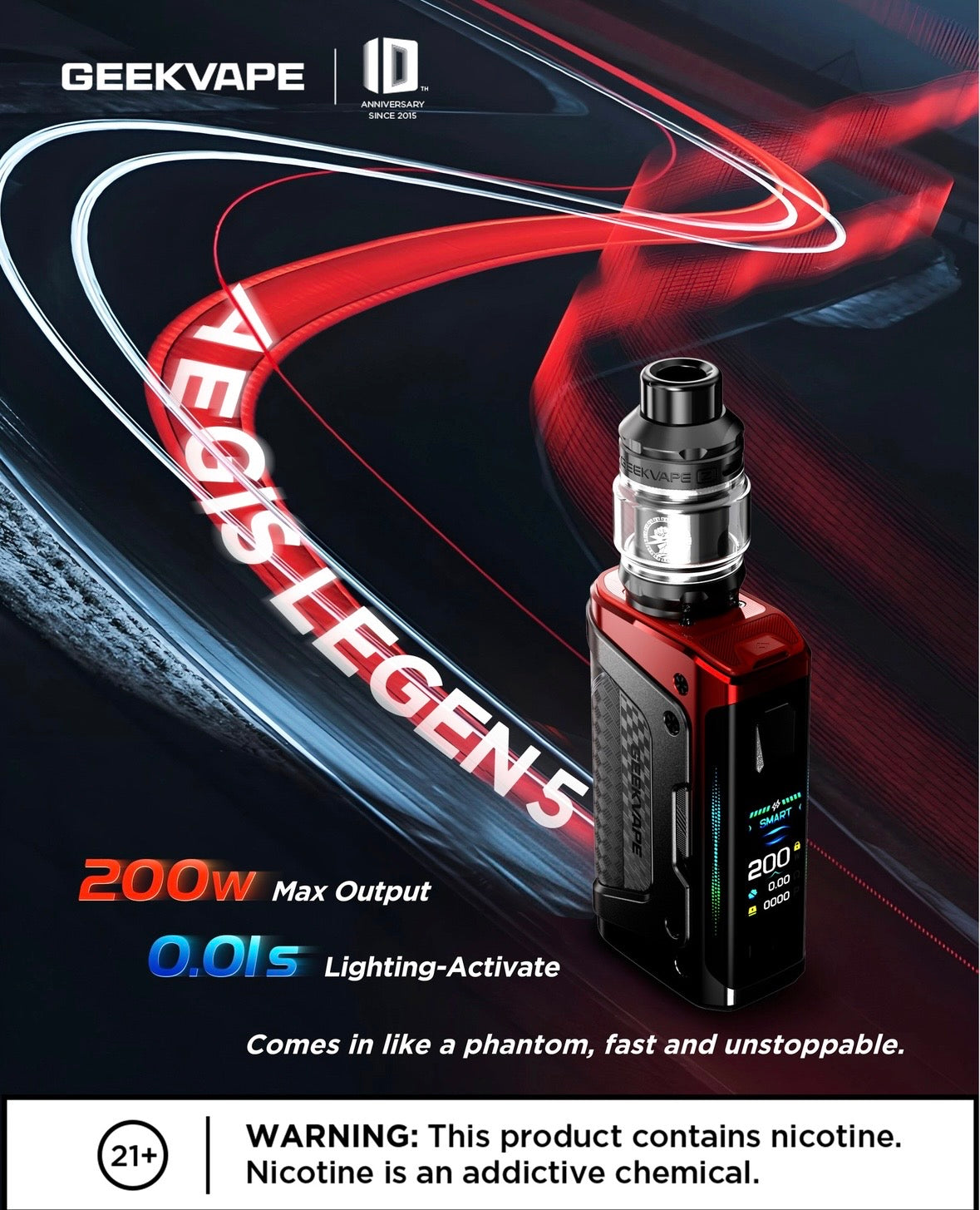 Cette cinquième édition du kit Aegis Legend de Geekvape permet de vapoter en inhalation directe avec un mod à deux accus 18650 (non fournis). Et avec le clearomiseur Z Sub-ohm Tank et ses résistances Z-Series. La box Aegis Legend 5 est un mod étanche, résistant à la poussière et aux chocs. Elle est classée IP-68 et bénéficie d'une fabrication avec plusieurs matériaux. Elle possède une puissance maximale de 200 watts avec plusieurs modes de vape tels que Eco, Smart, Custom ou le contrôle de température.